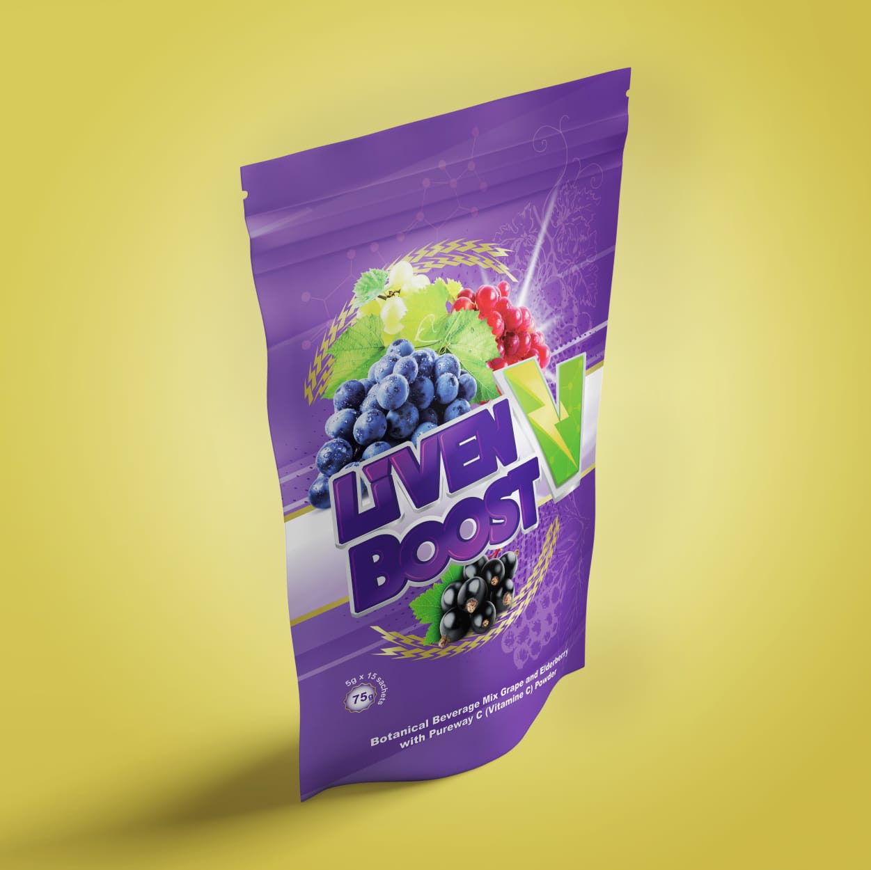 Main Ingredient of Liven V Boost: Vitamin D3, Grape, Sucralose, Sodium Bicarbonate, Fructose, Elderberry, Magshape, Pureway C, Citric Acid, Maltodextrin.